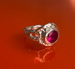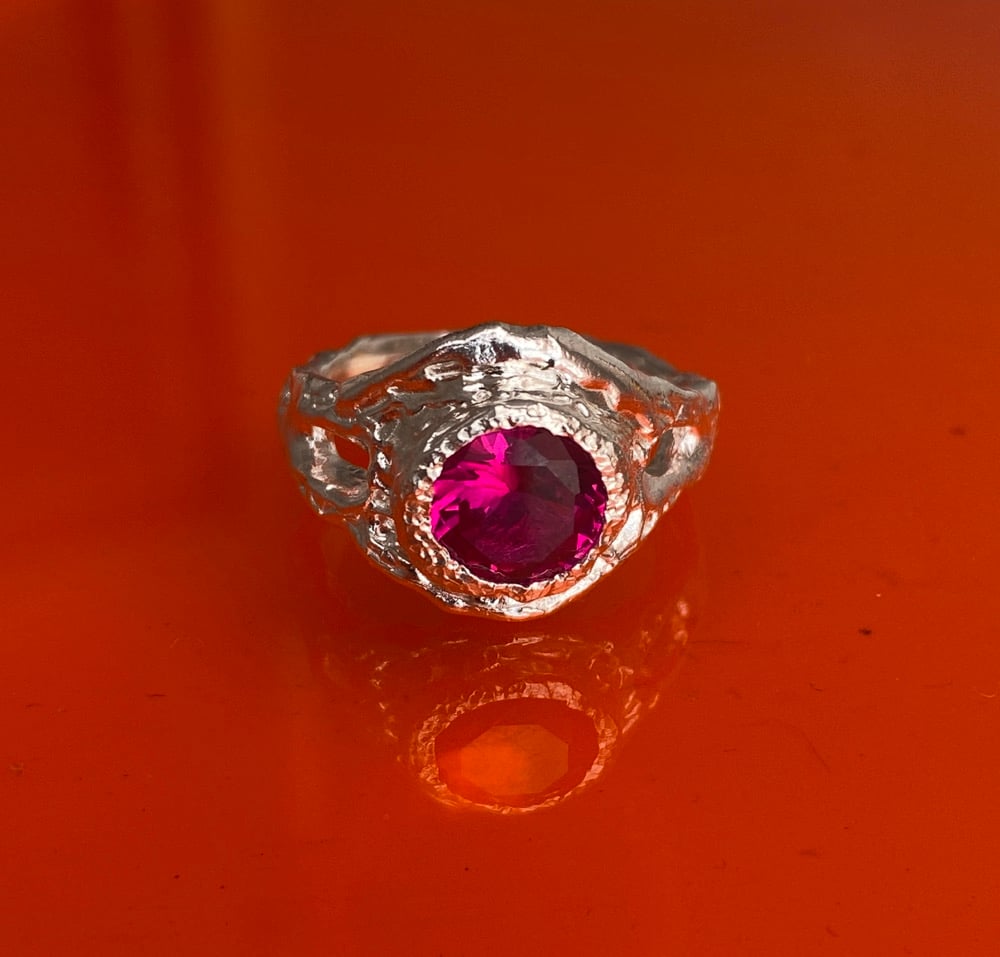 Bague organique fait en argent sterling et sertie d’un zircon rouge-rose.